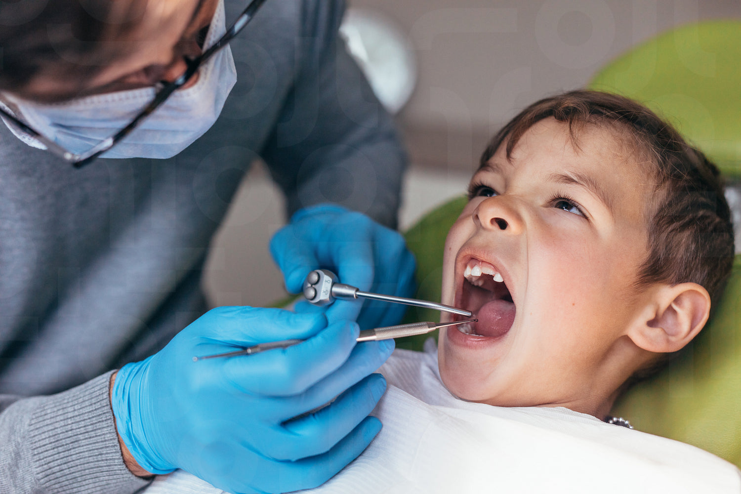Pediatric dentist examining teeth of boy patient in dental clinic using dental tools. Little boy getting dental treatment.