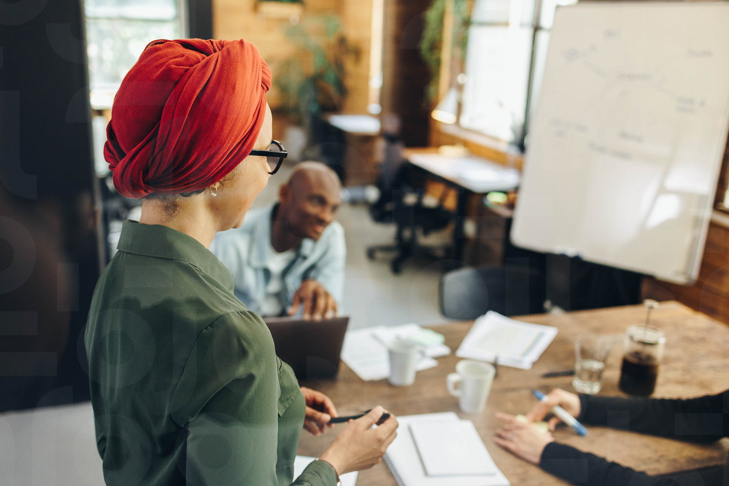 Muslim team leader having a meeting with her business colleagues in a modern boardroom. Happy ethnic businesswoman wearing a headscarf in a multicultural workplace.