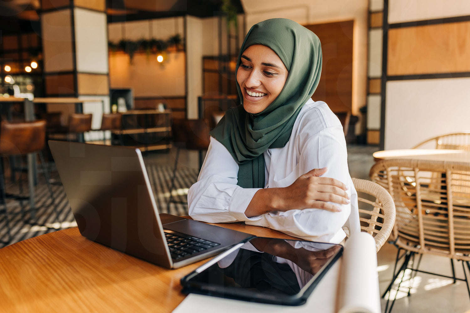 Muslim university student smiling happily while having a video conference with her tutor in a cafe. Cheerful woman with a hijab attending an online class in a coffee shop.