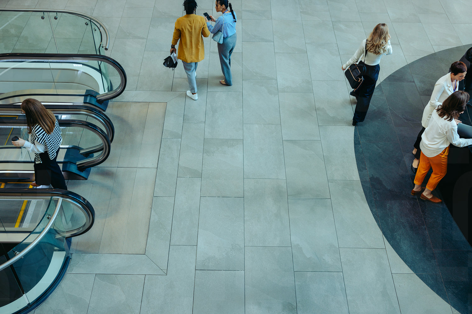 Professionals in a corporate office lobby setting symbolize business growth, highlighting teamwork and consulting. Ideal image for corporate presentations.