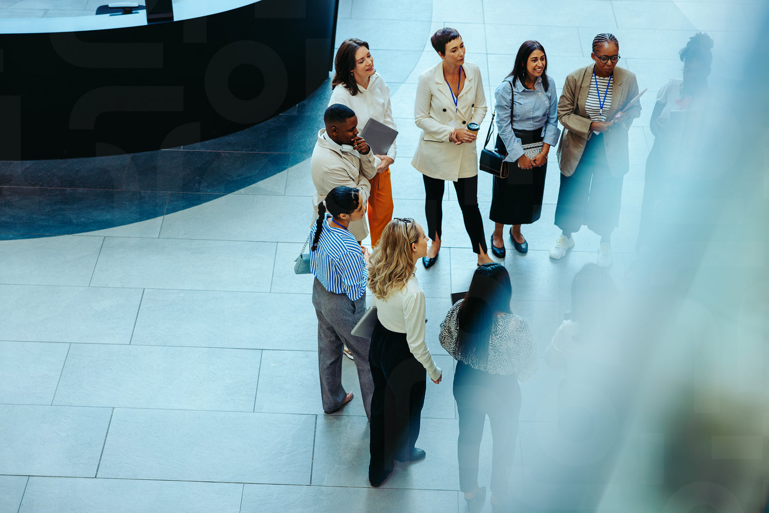 Diverse group of business professionals gathered in the lobby of an accounting firm