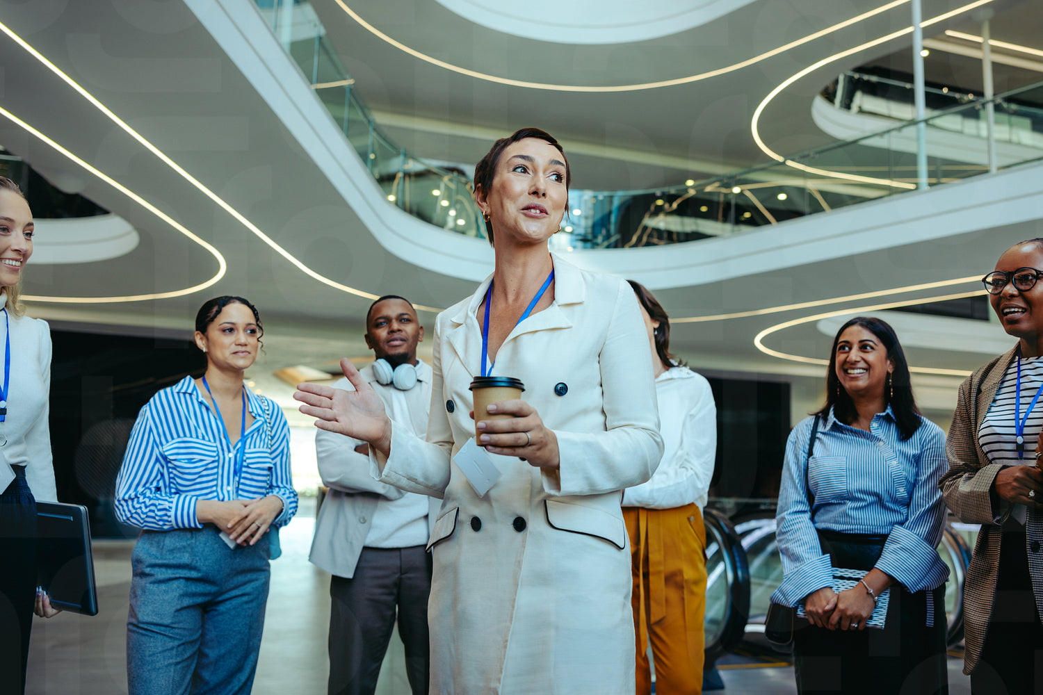 Female manager introduces new recruits at an accounting firm, emphasizing team collaboration and professional growth in a contemporary corporate setting.