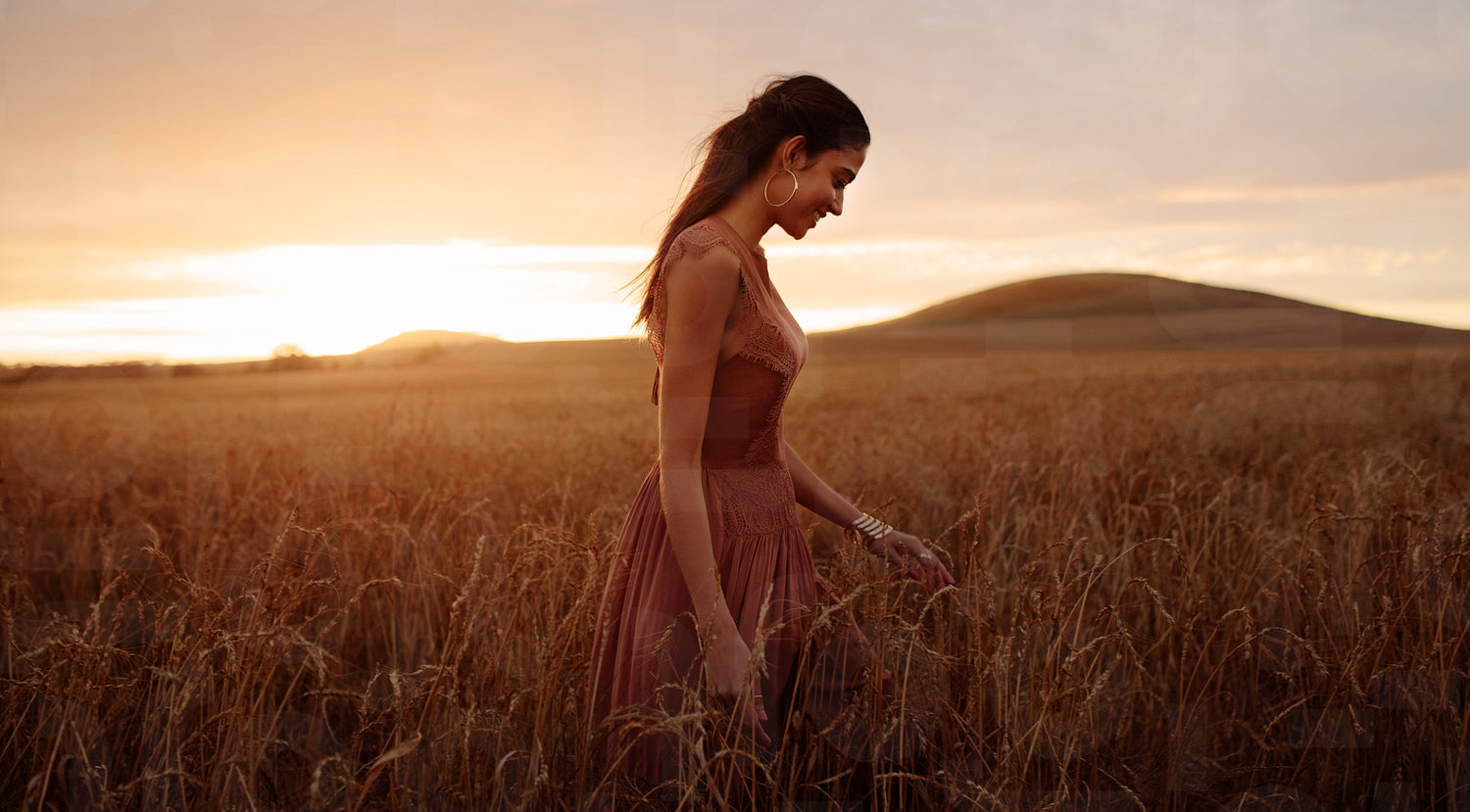 Young woman in the wheat field with sun setting in background. Female in countryside wheat field with golden sunlight of sunset.