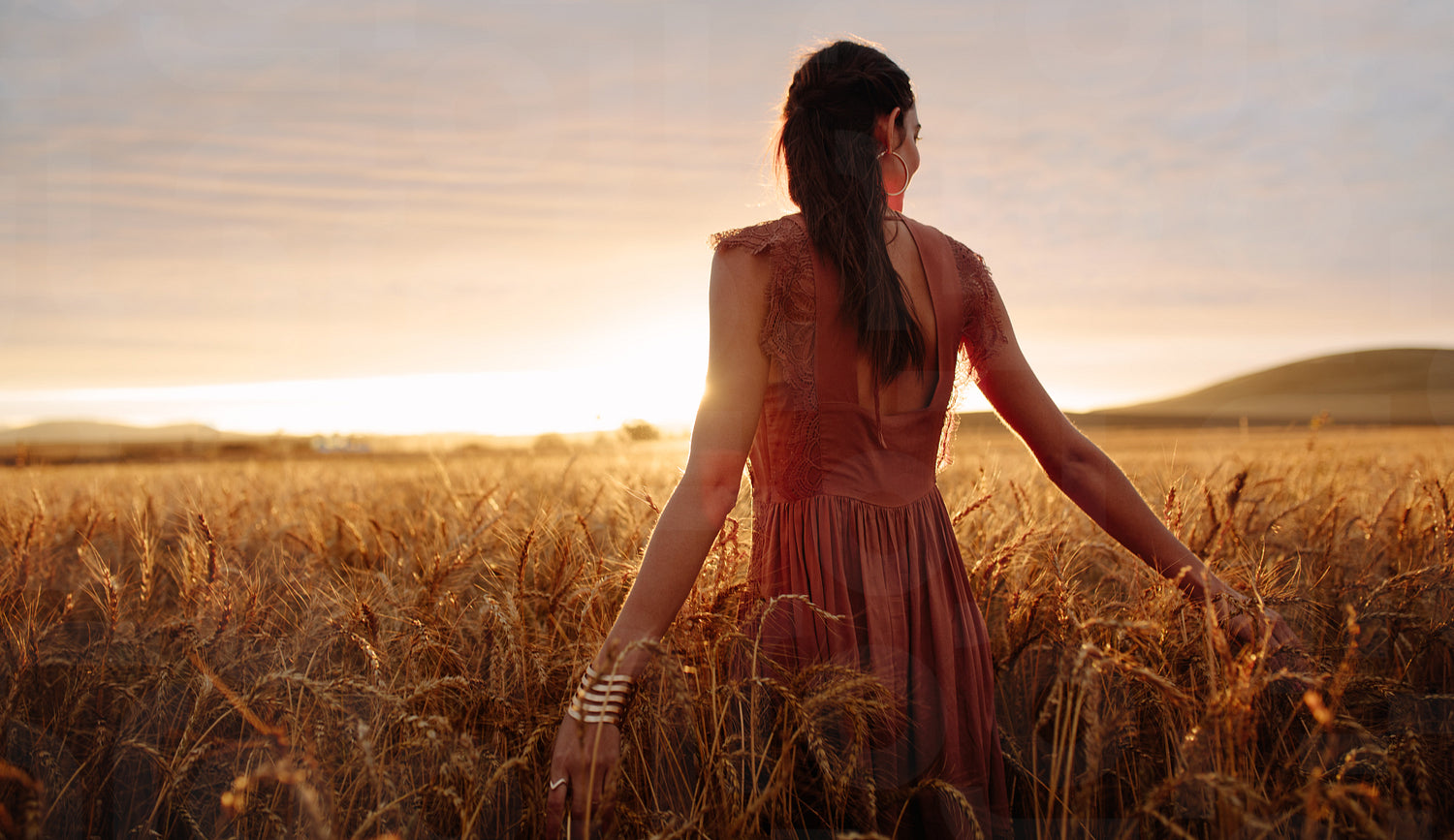 Carefree woman strolling in the wheat field