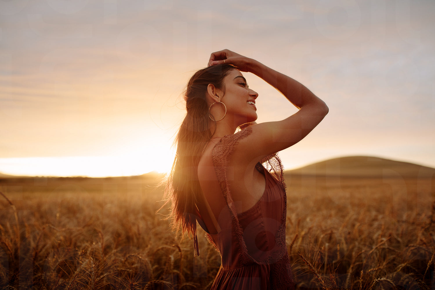 Young woman in a field during dusk. Female enjoying a day in nature during sunset.