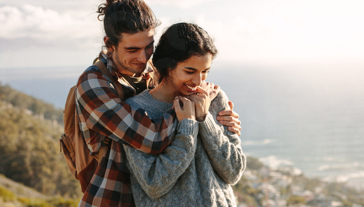 Portrait of beautiful young couple on a vacation. Man hugging his girlfriend from behind, both standing on a cliff.