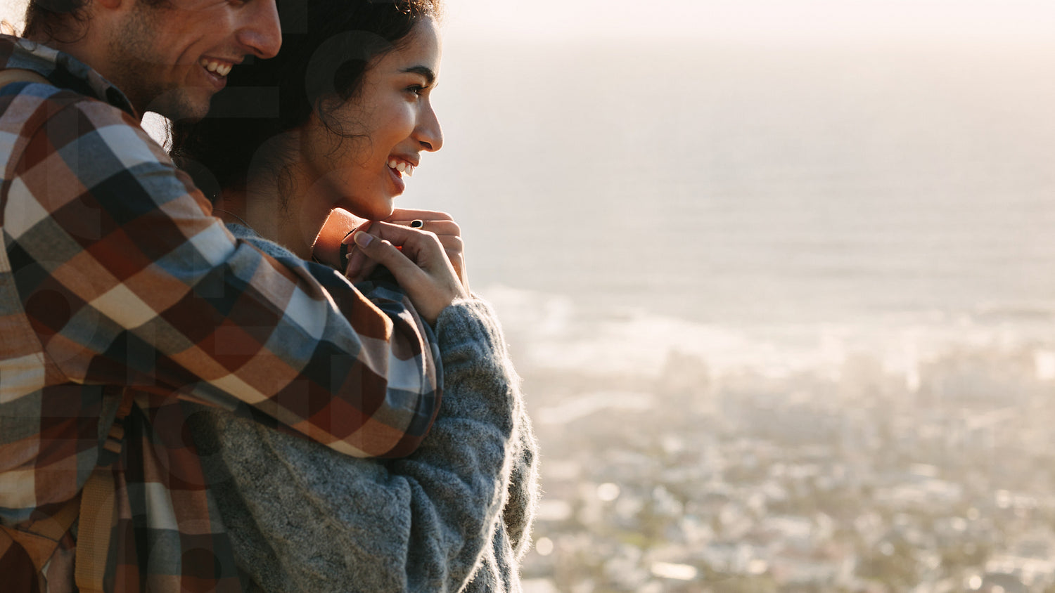 Close up portrait of young couple in love standing together outdoors and enjoying the moment. Man and woman embracing and looking at a view.