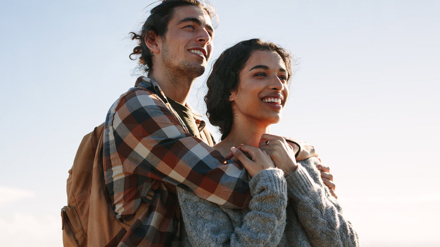 Young man with backpack standing with his woman looking away and smiling. Loving couple looking at a view and with smile on face.