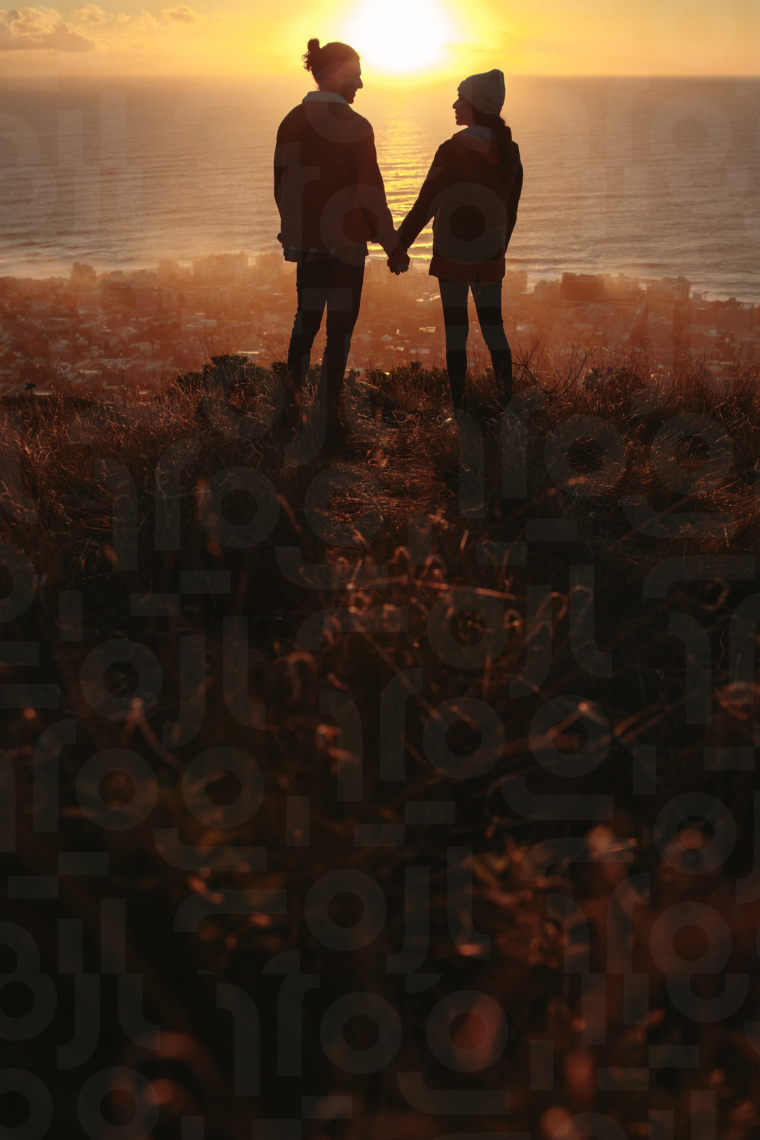 Silhouette of young couple in love standing together on the mountain peak at sunset. Love couple on peak looking at each other during sunset. Vertical shot.