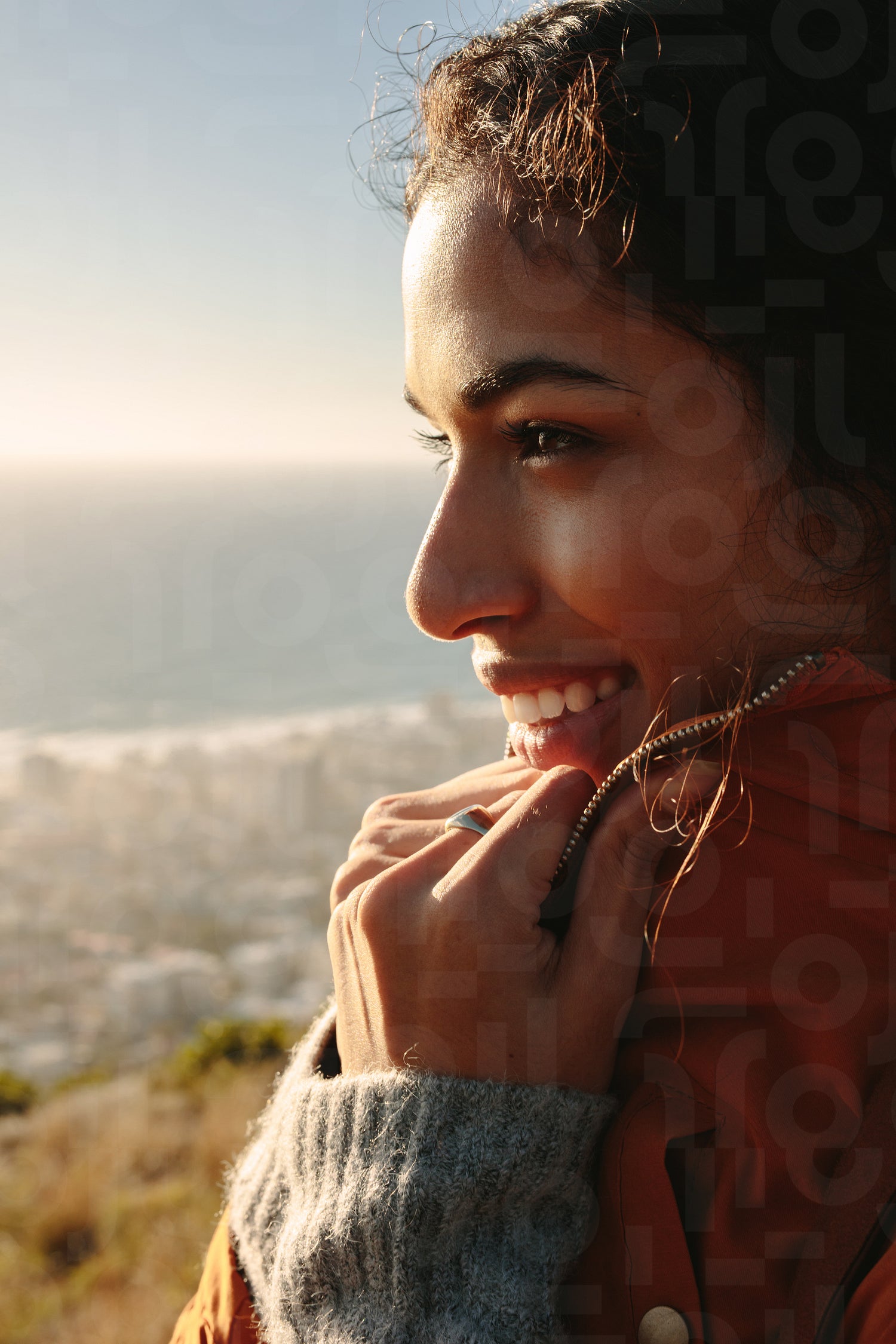 Vertical shot of female model in wear standing outside on a cliff and looking away smiling. Relaxed african woman looking at a view.