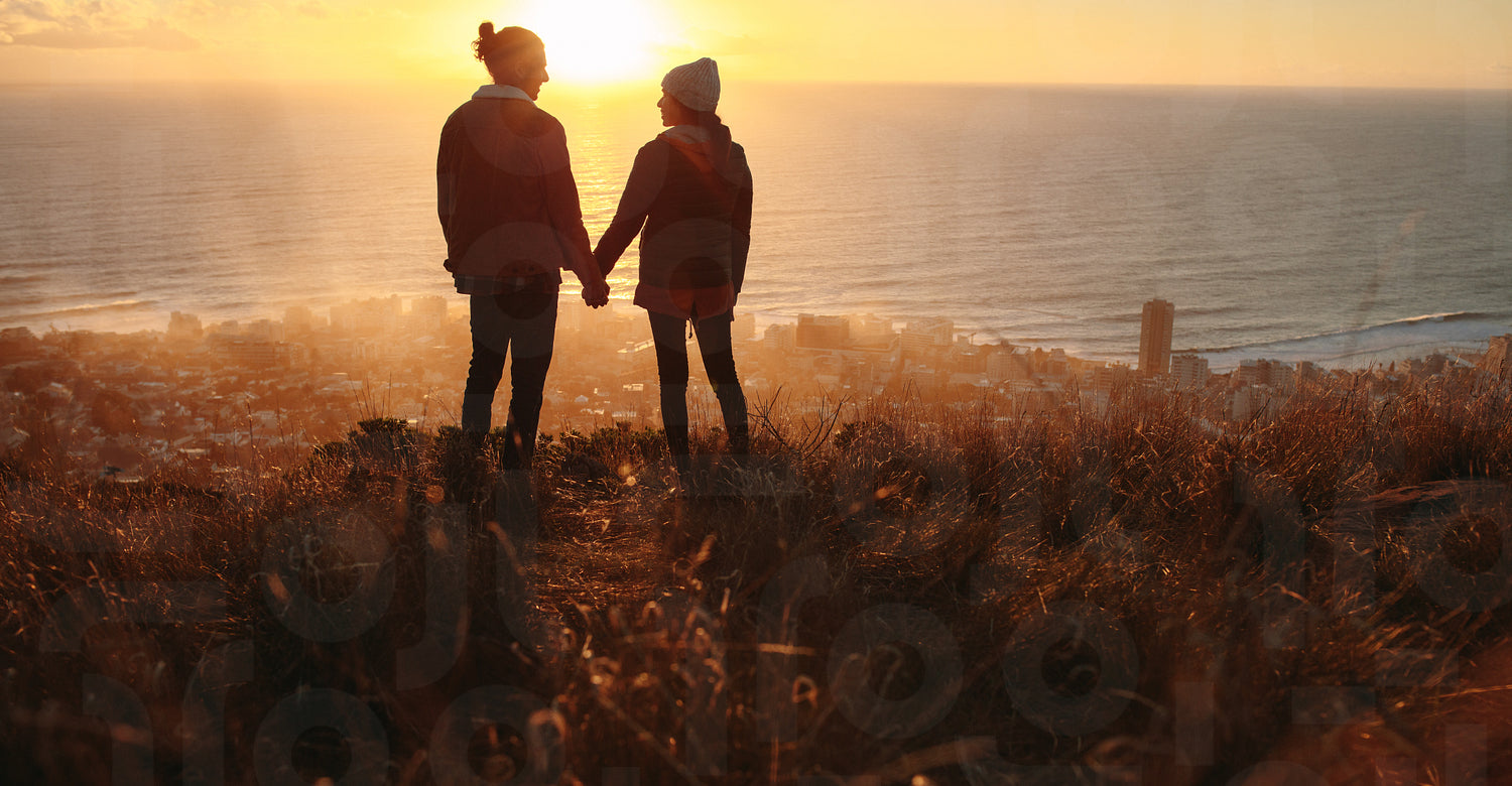 Silhouette of young man and woman in love standing on the mountain peak holding hands and looking at each other with seascape in background. Romantic couple on peak at sunset.