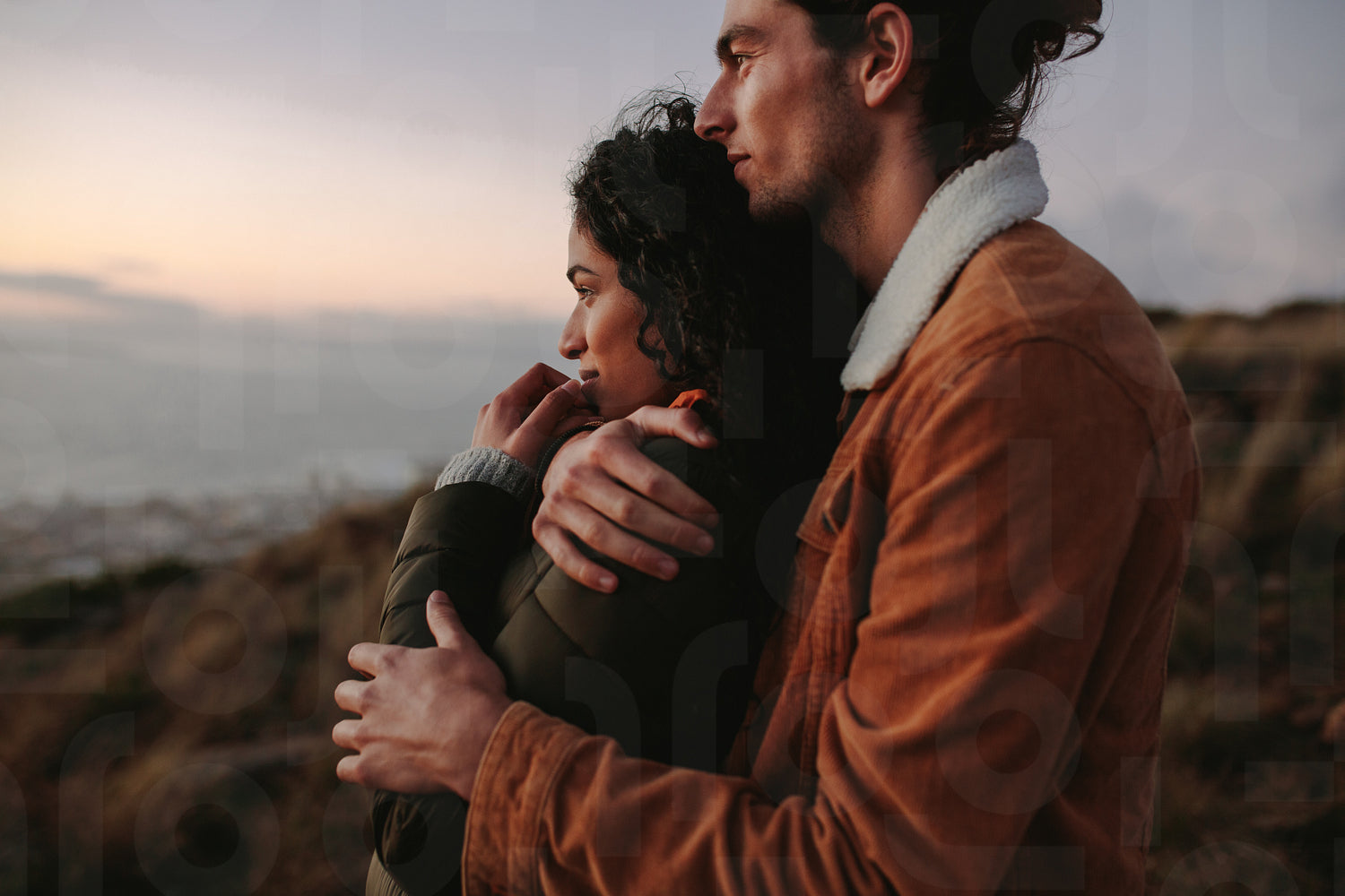 Romantic young couple standing in mountain together and looking at view. Young man embracing his girlfriend and looking away.