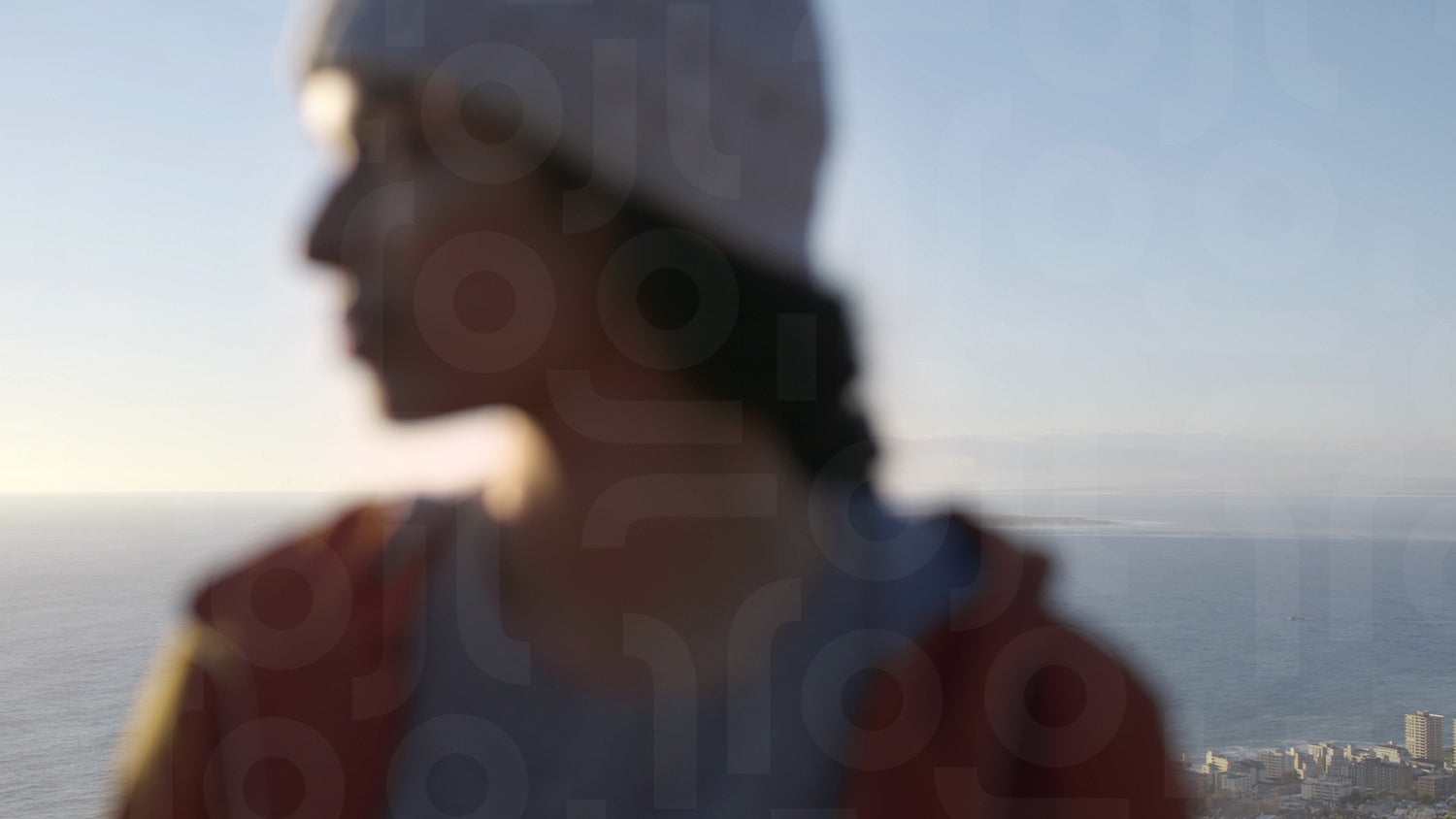 African woman in warm clothing and knitted cap standing outdoors with sea in background. Smiling girl on a mountain top on winter day.