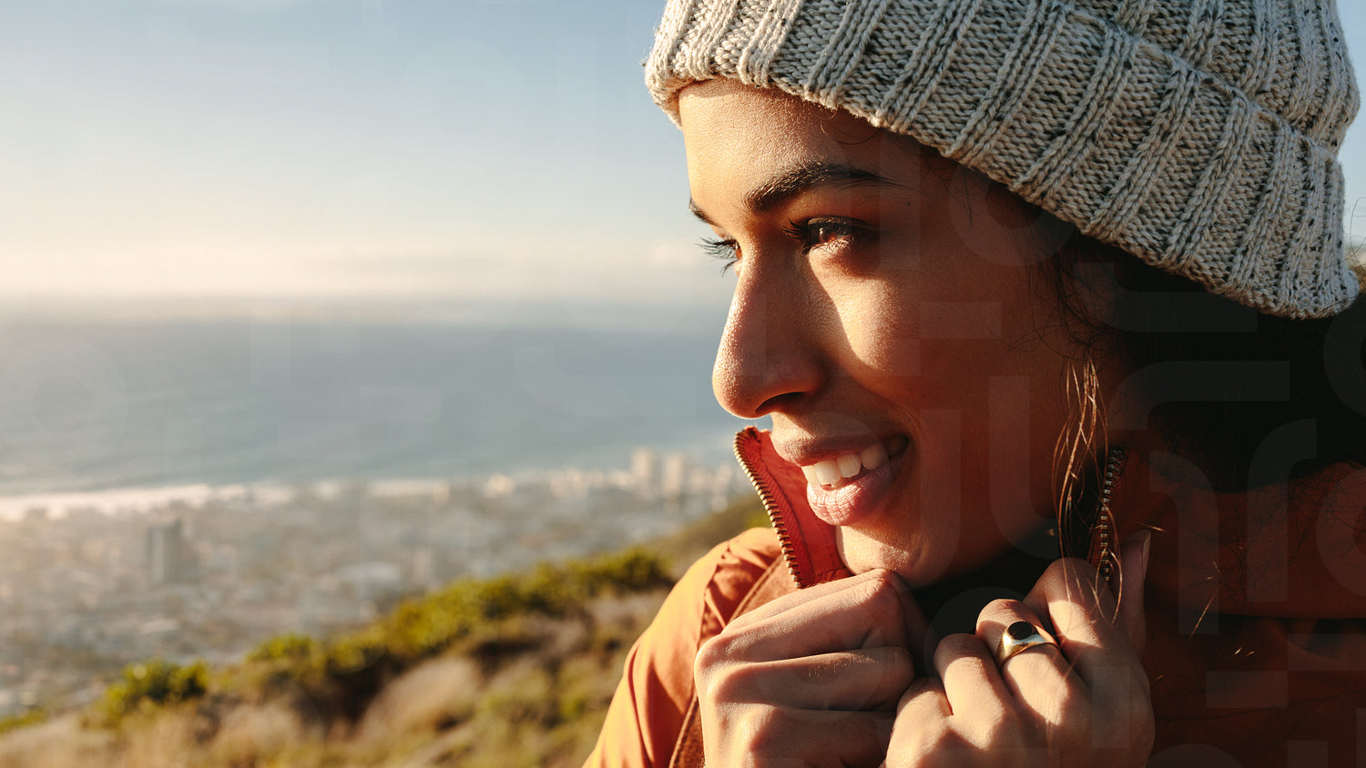 Close up of attractive young female in warm clothing enjoying the seascape view from mountain top. African woman in warm jacket and knitted cap.