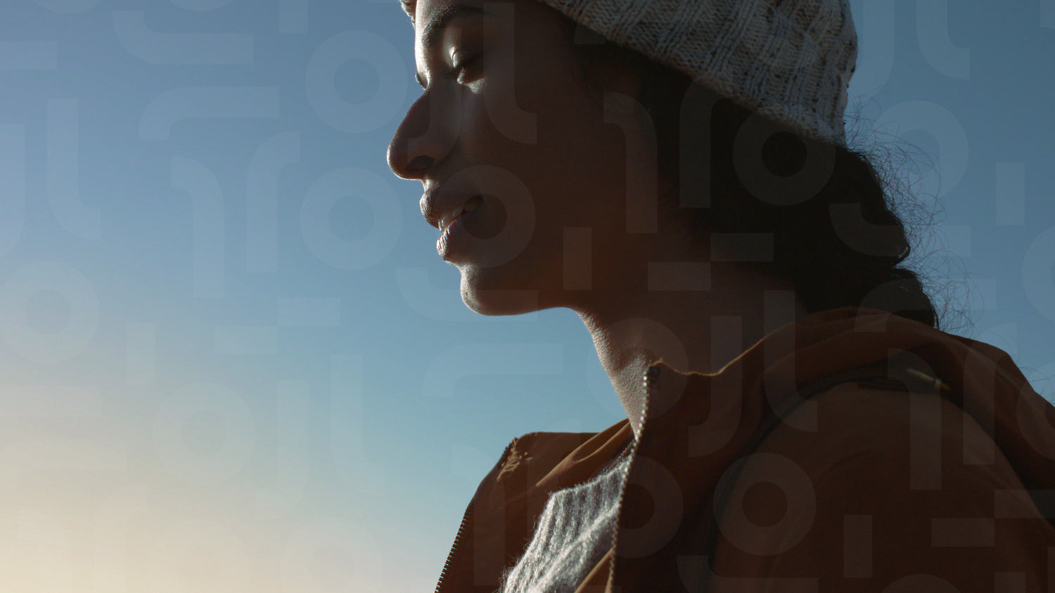 Close up of woman hiker standing outdoors and looking around. African girl in warm coat and knitted cap.