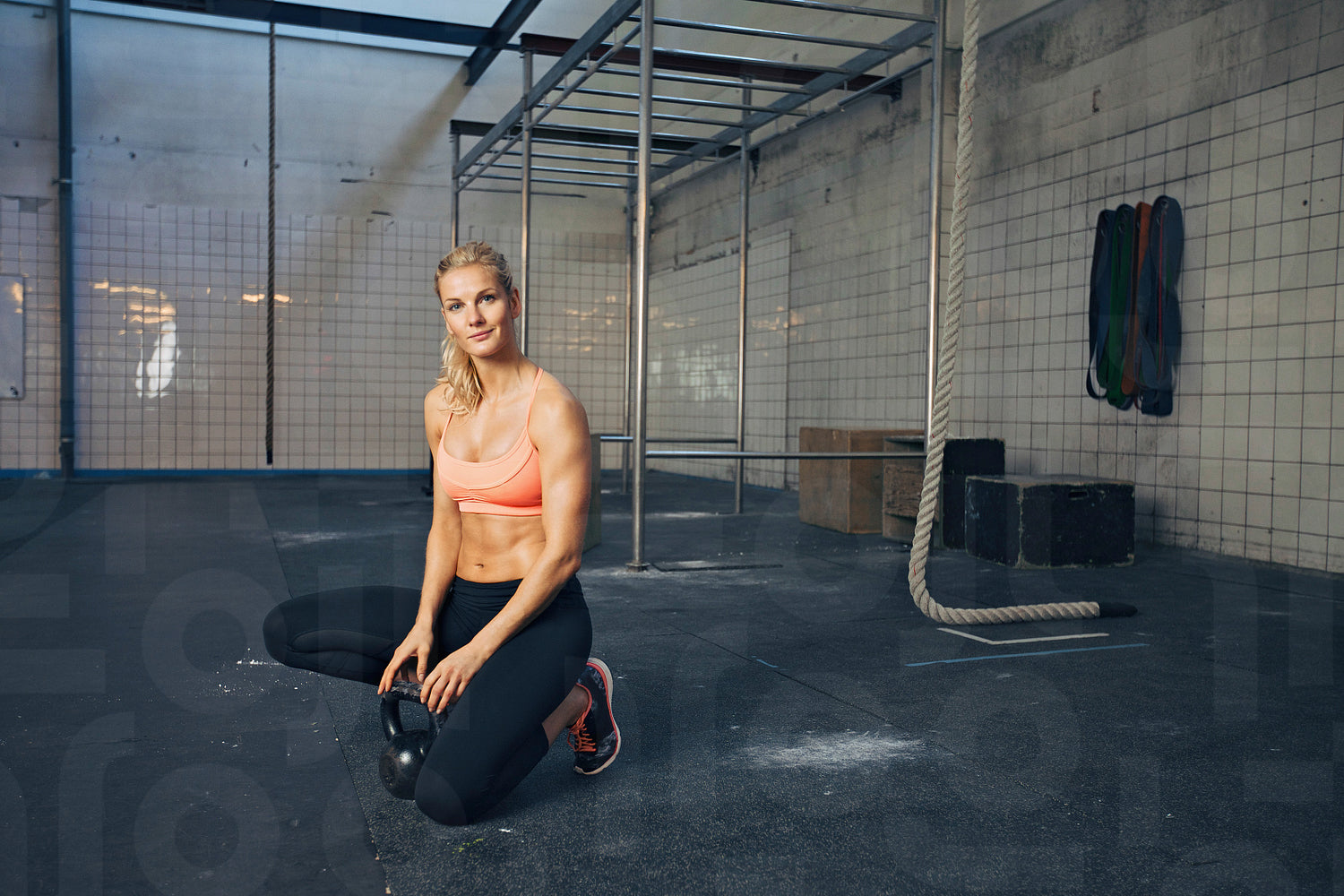 Beautiful young woman with kettle bell looking at camera. Fit caucasian female athlete at crossfit gym relaxing on floor.