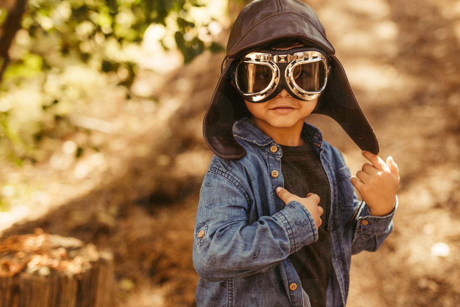 Cute boy with pilot goggles and hat. Kid dreaming to be pilot playing in forest.