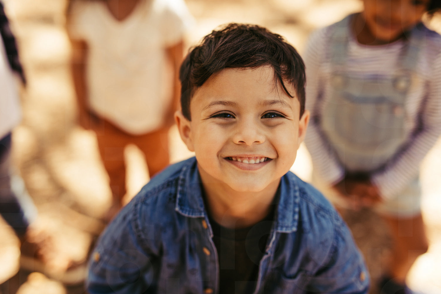 Close up portrait of cute boy smiling at camera with friends at background. Kid with friends outdoors.