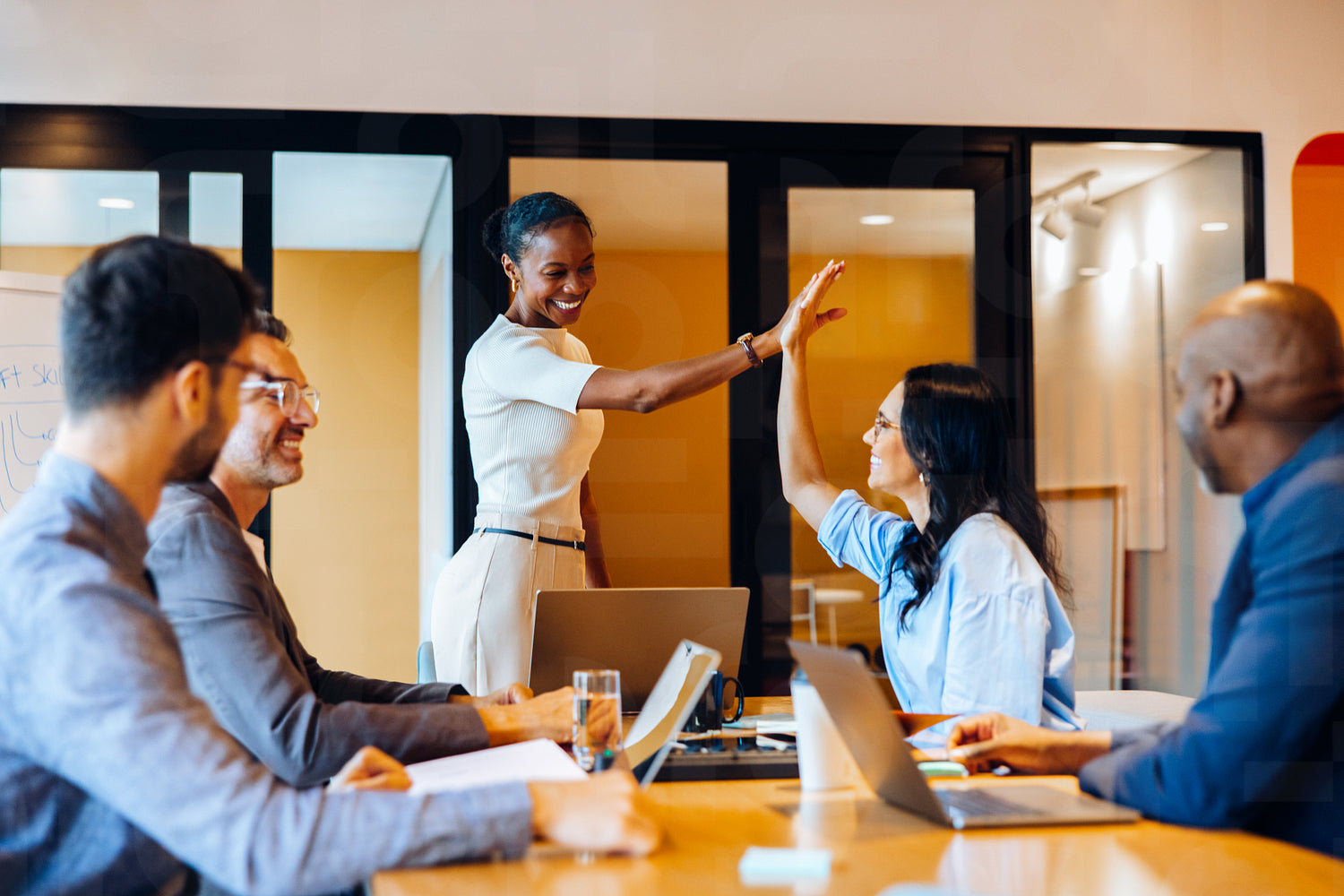 Diverse business team celebrating success with a high five during meeting
