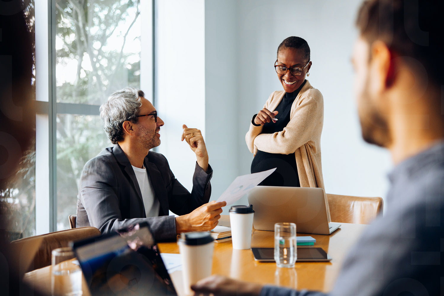 Business professionals of diverse backgrounds engaged in active discussion during a meeting around a table. Bright natural light creates a collaborative and dynamic environment.