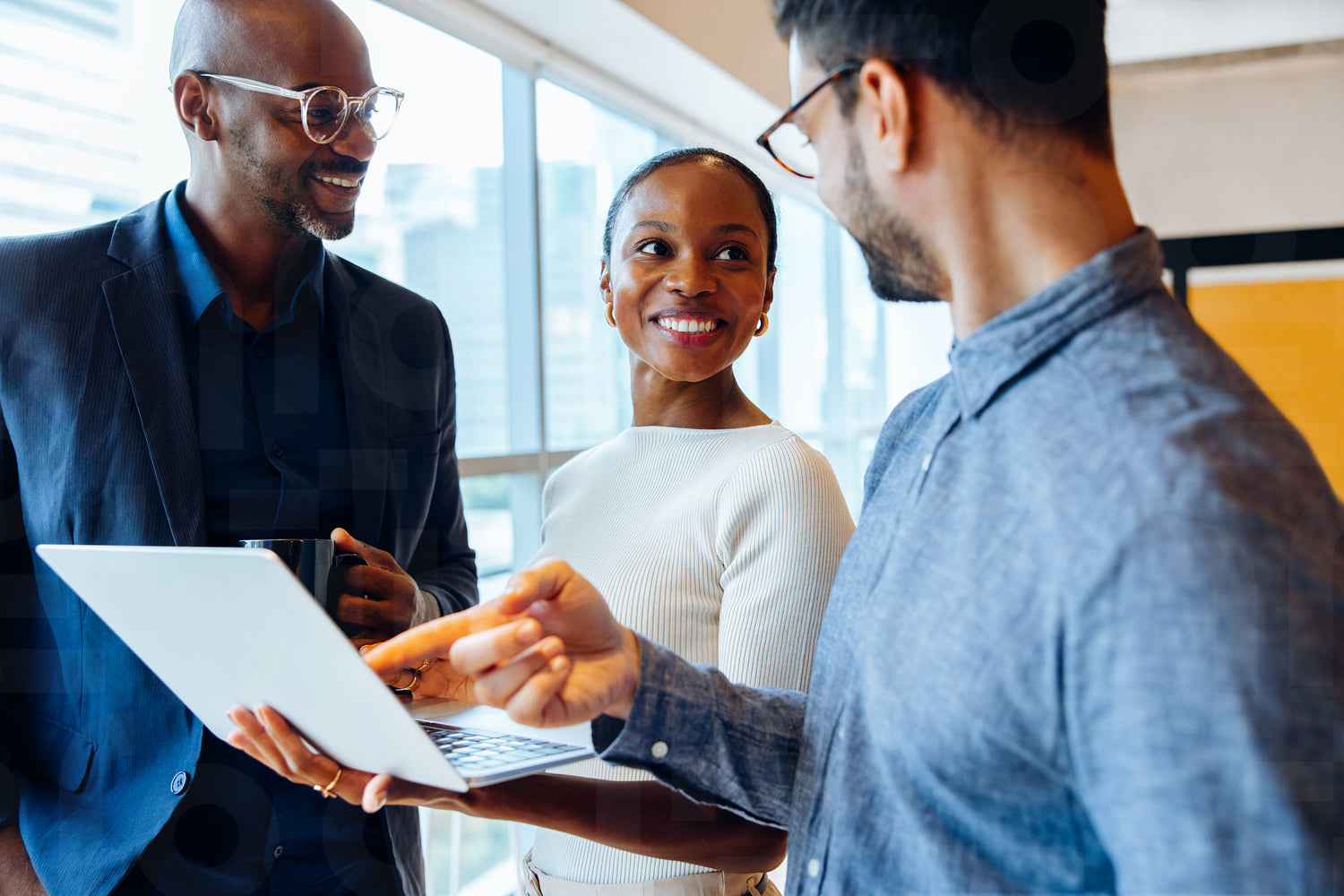 Three professionals standing together, discussing ideas and sharing information on a laptop.