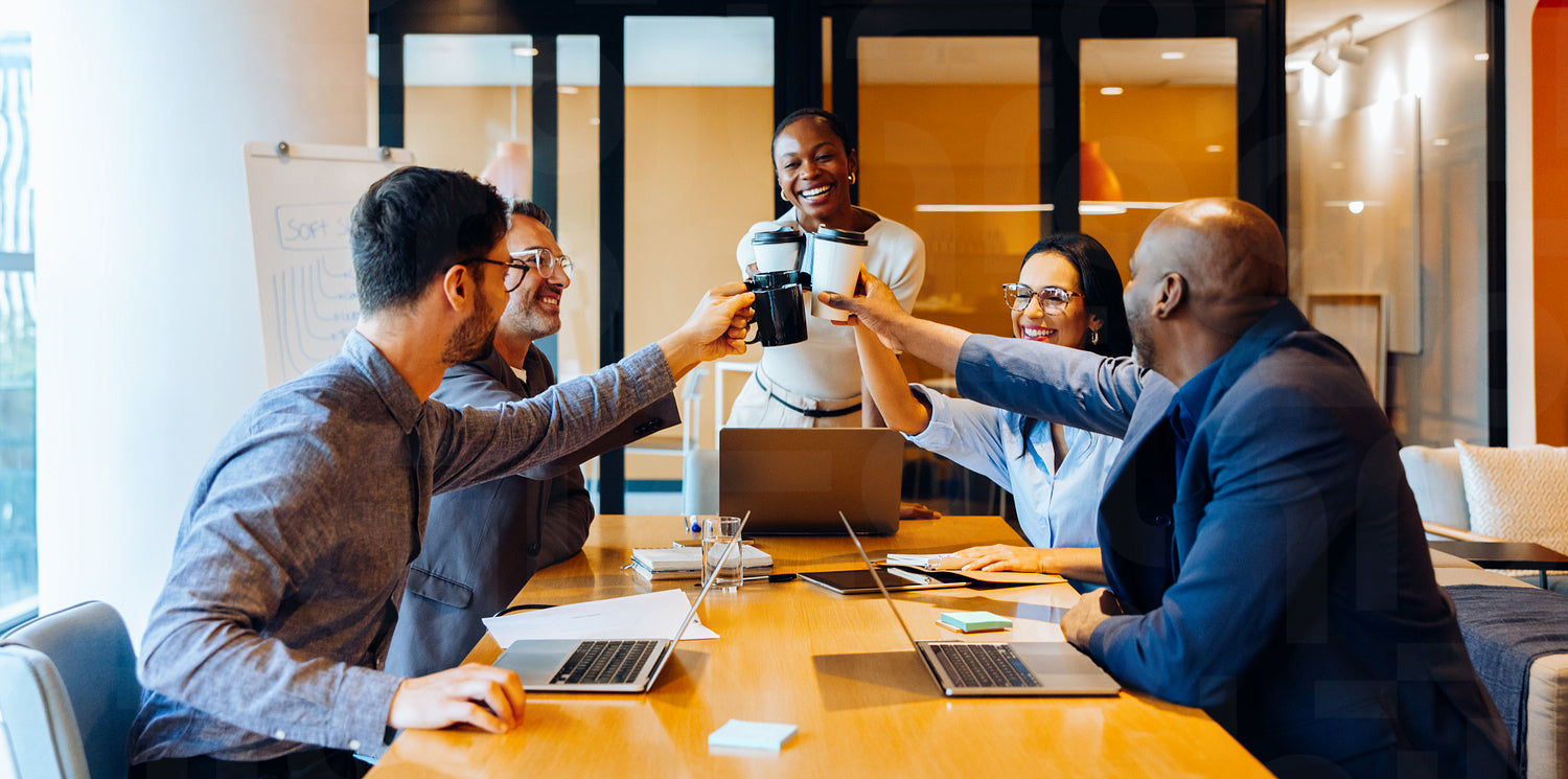 A group of diverse professionals celebrates with coffee during a meeting at the office. Each member actively participates, creating a friendly and supportive environment.