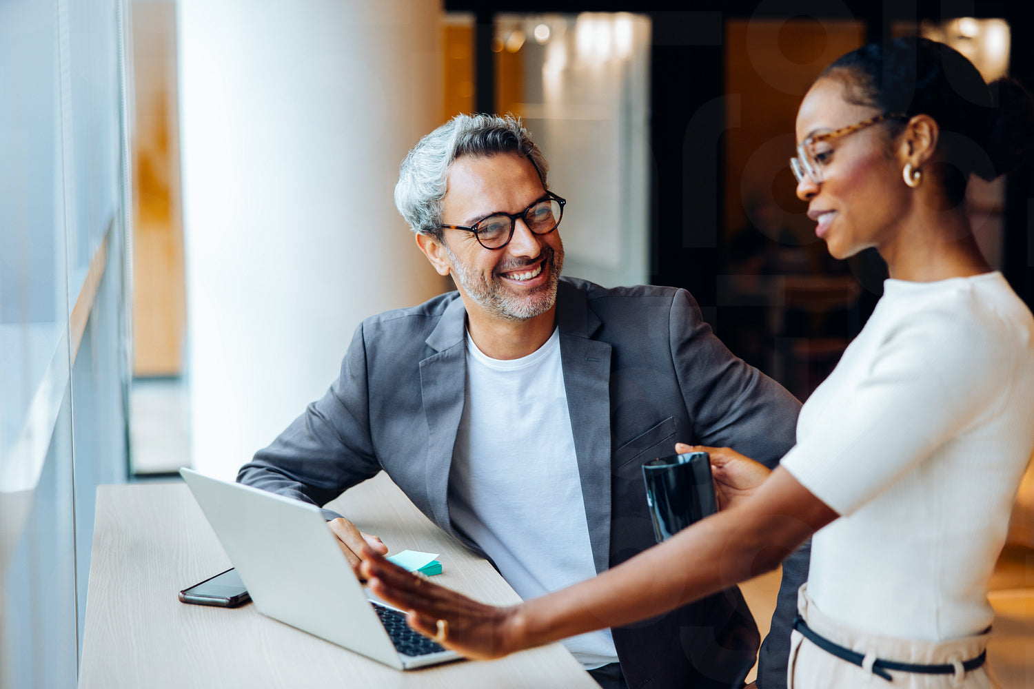 Colleagues engaging in a friendly discussion while referencing a laptop, forming a professional atmosphere. The man is seated, and the woman is holding a mug during the exchange.