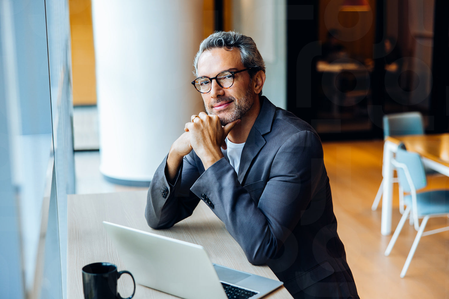Confident middle-aged man wearing glasses and a suit sitting at a desk with a laptop, appearing thoughtful and focused in a bright, open-plan office setting.