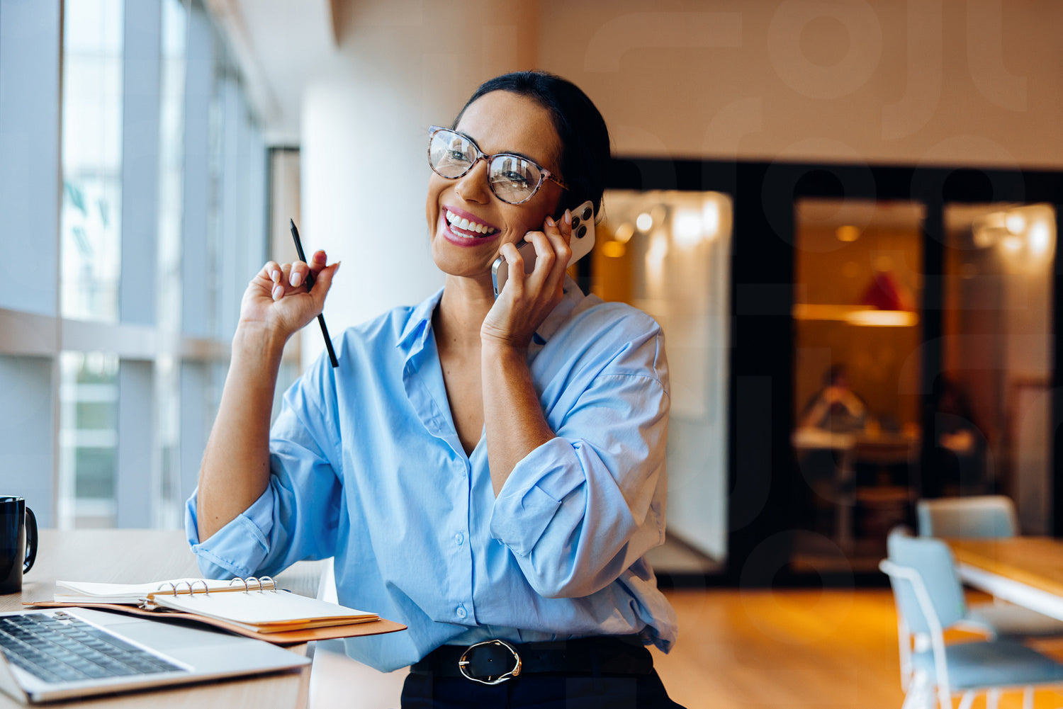 Professional woman in her thirties wearing glasses while having a joyful phone conversation. Office setting with notepad, laptop, and window view indicative of a productive business environment.