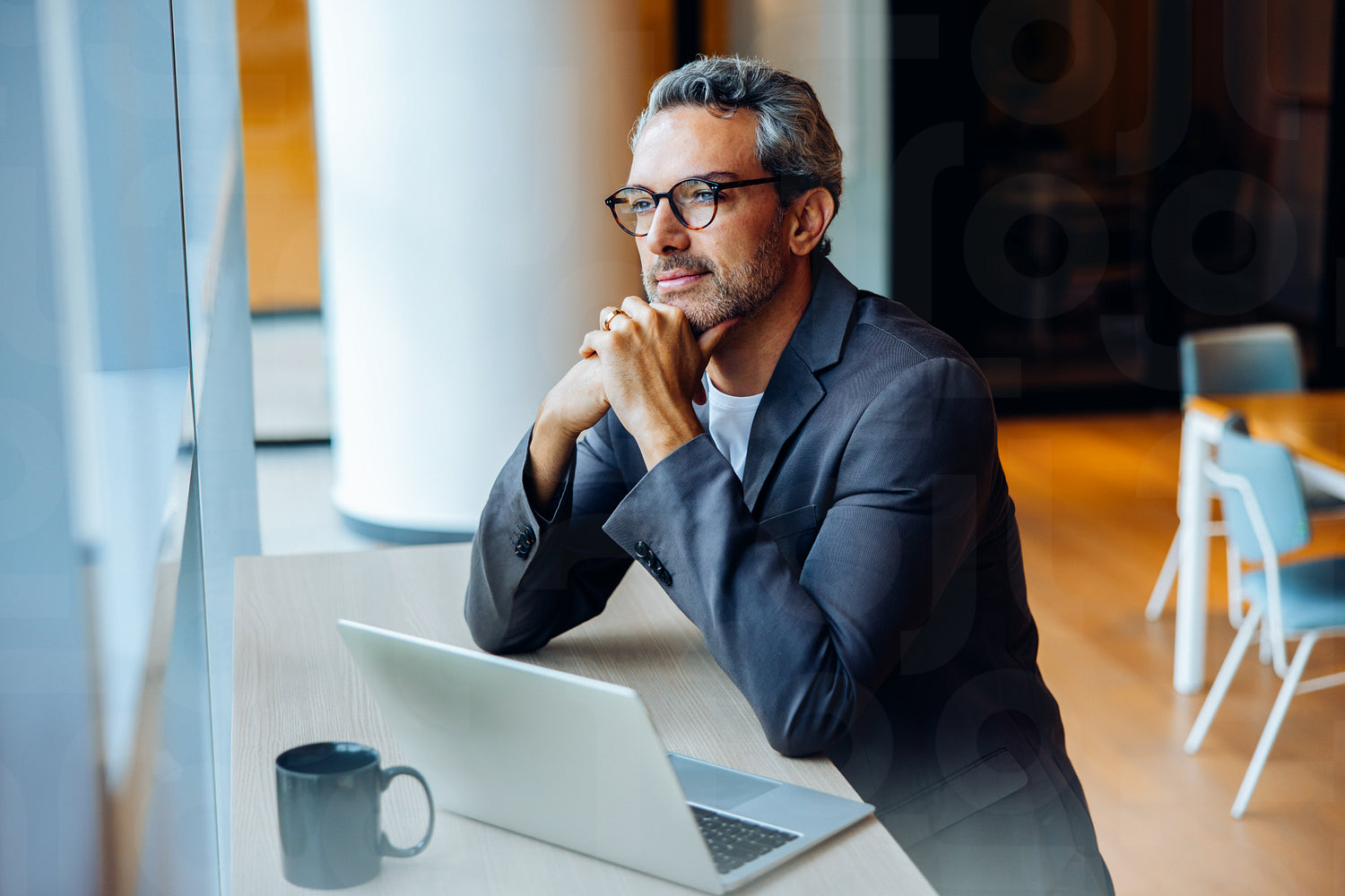 Thoughtful businessman sitting at desk by window with laptop and mug