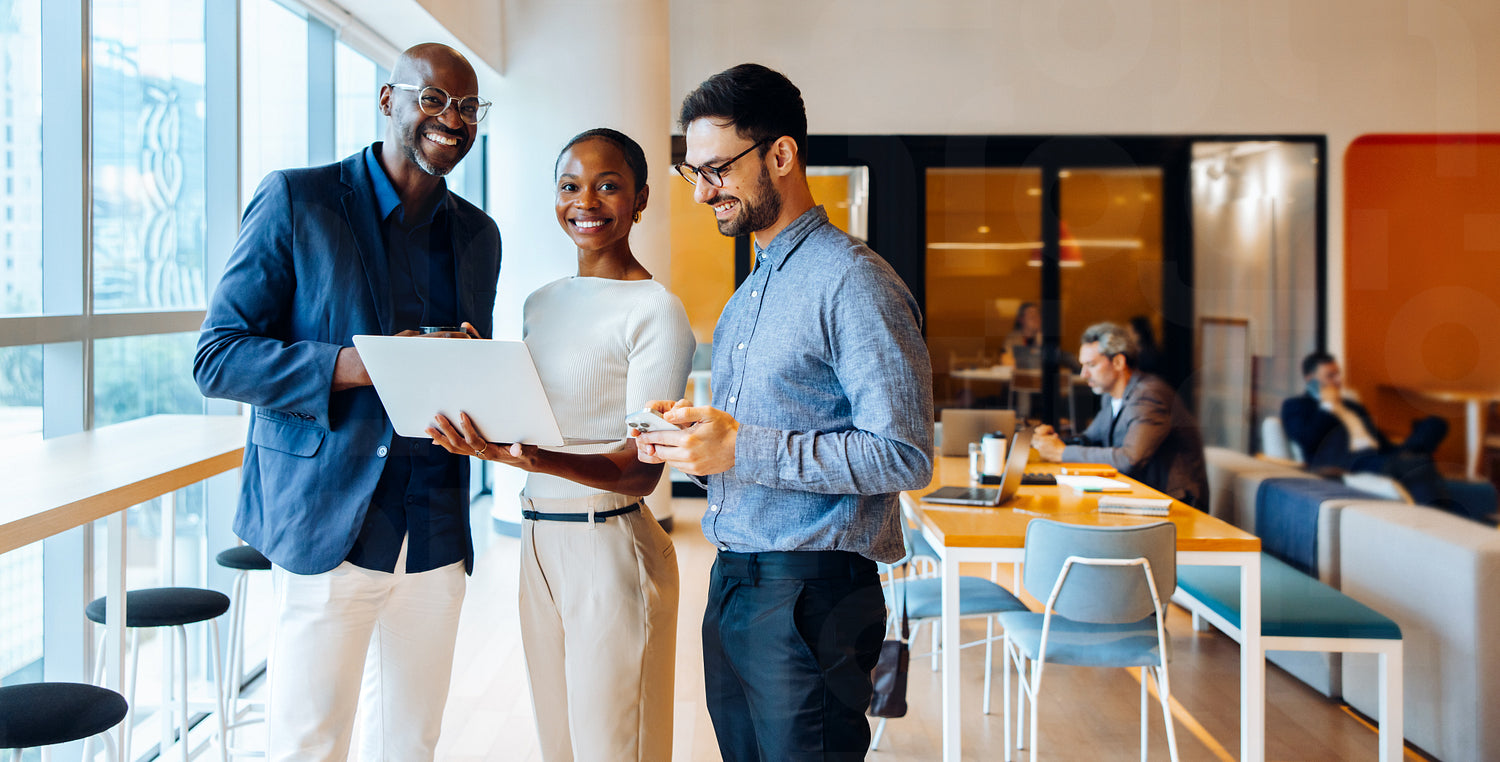 Professionals gather around a laptop, engaged in a lively discussion in a cozy workplace. The interior design of the space features natural light and comfortable seating, emphasizing productivity.