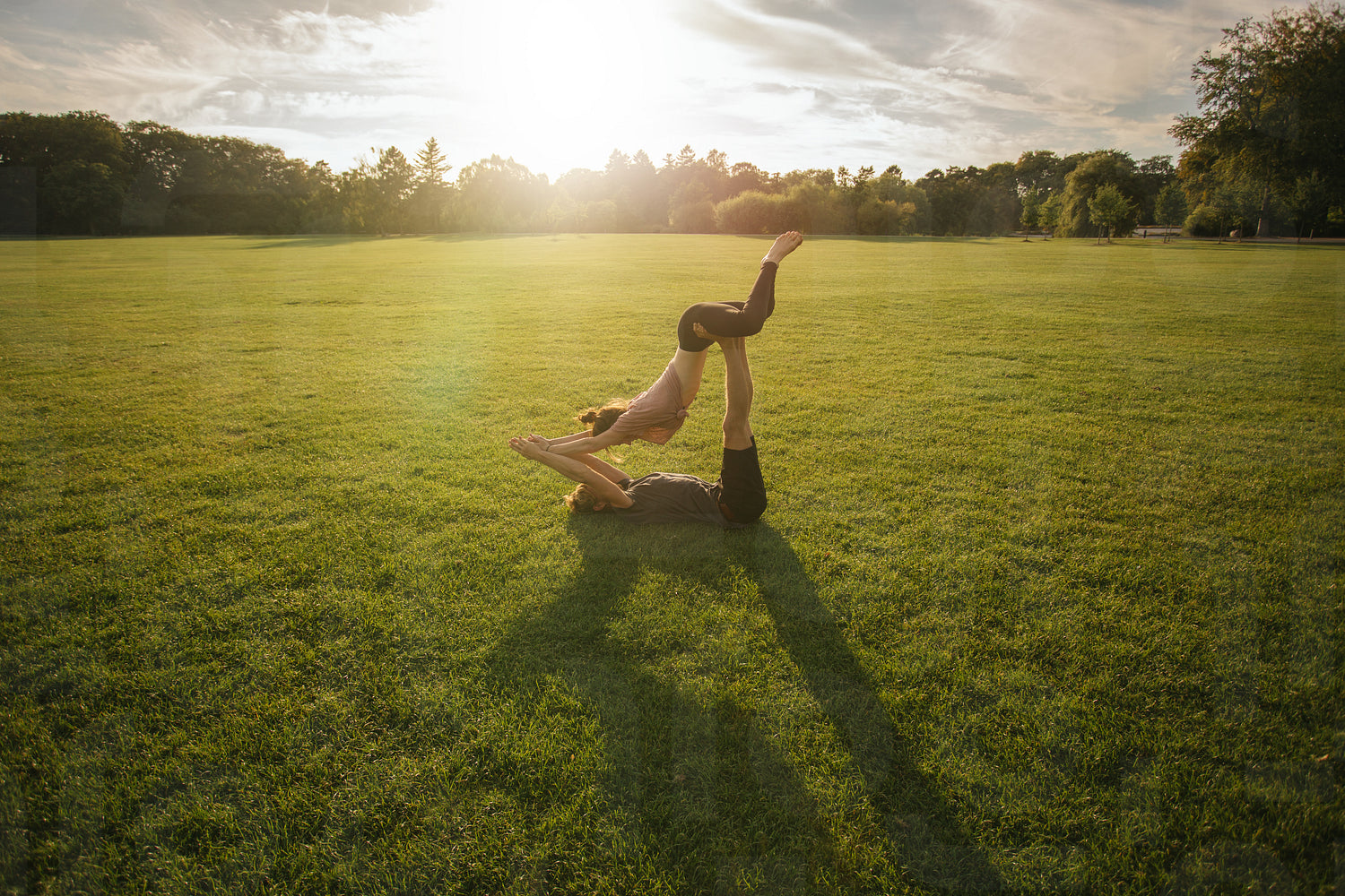 Outdoor shot of young man and woman doing yoga in pair. Couple doing acrobatic yoga workout on lawn.
