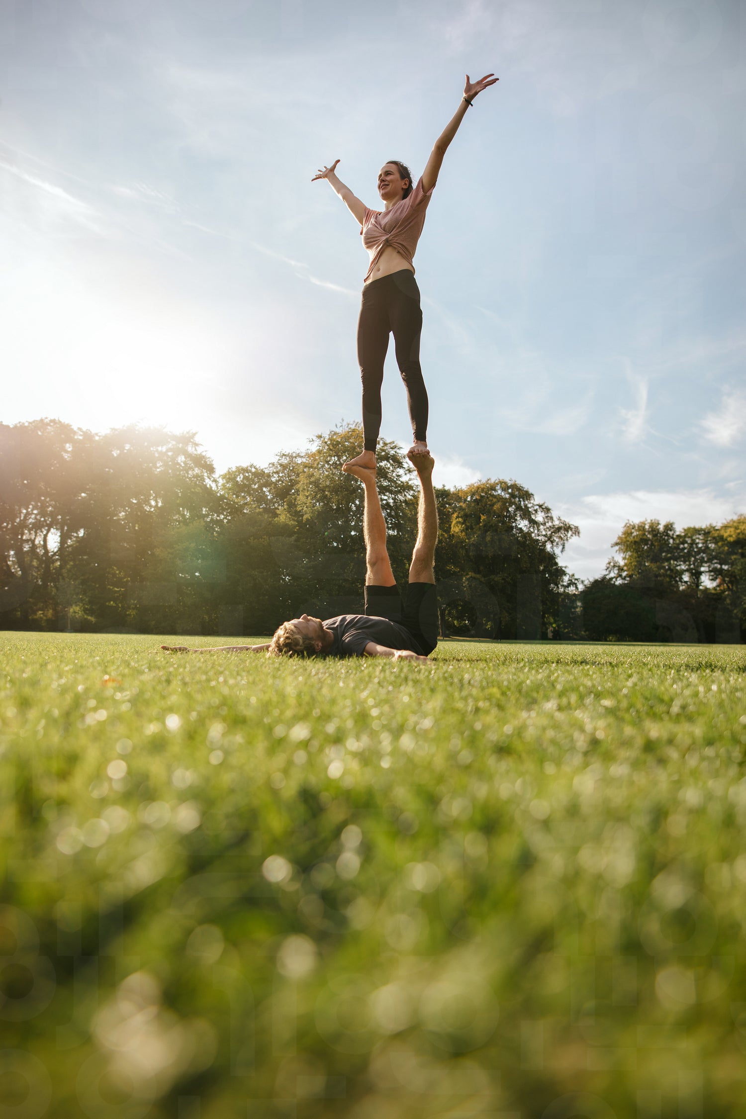 Vertical shot of fit young couple doing acroyoga exercise in park. Man lying on grass and balancing woman.