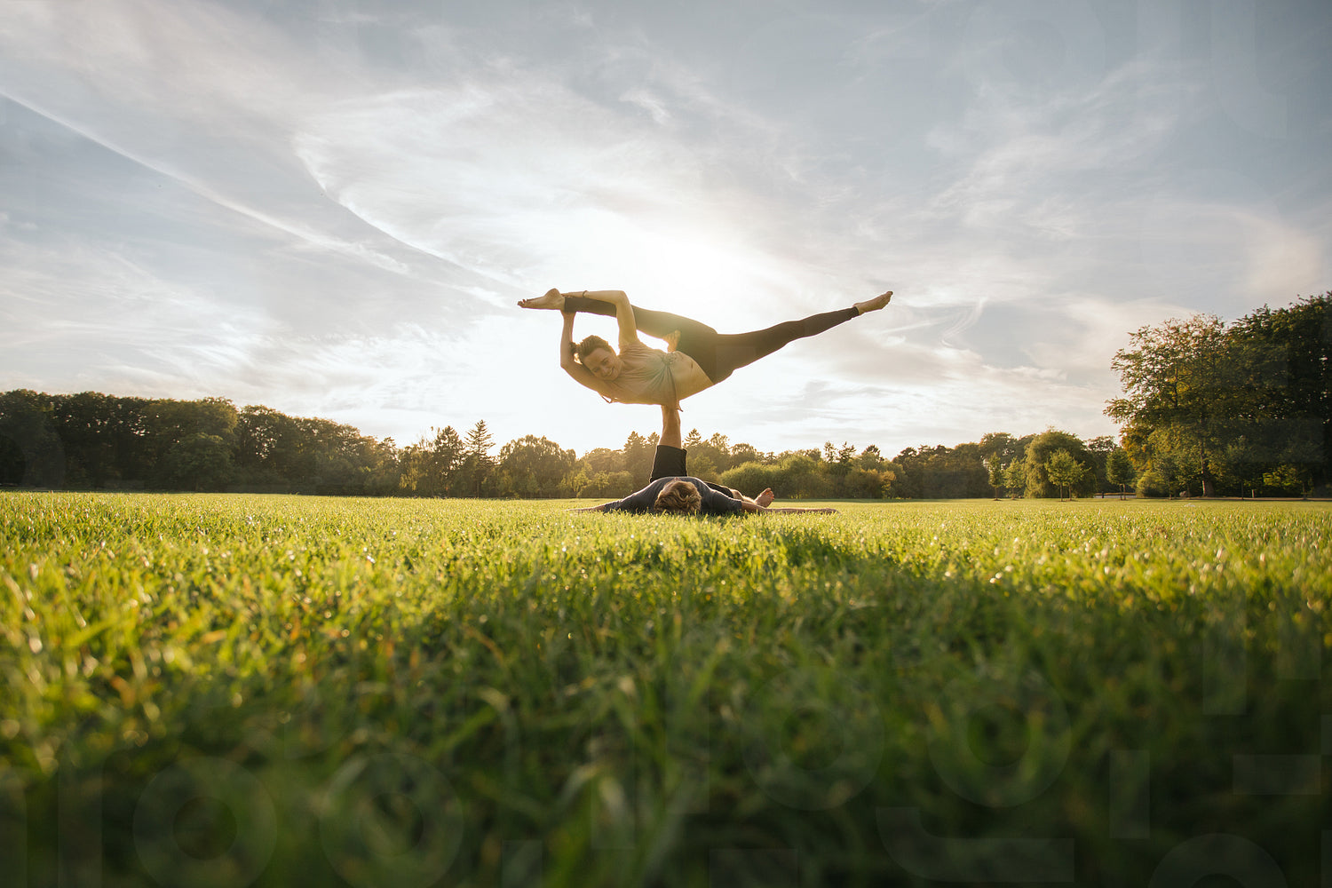Fit young couple doing acro yoga. Man lying on grass and balancing woman in his feet. Acrobatic balance in park.