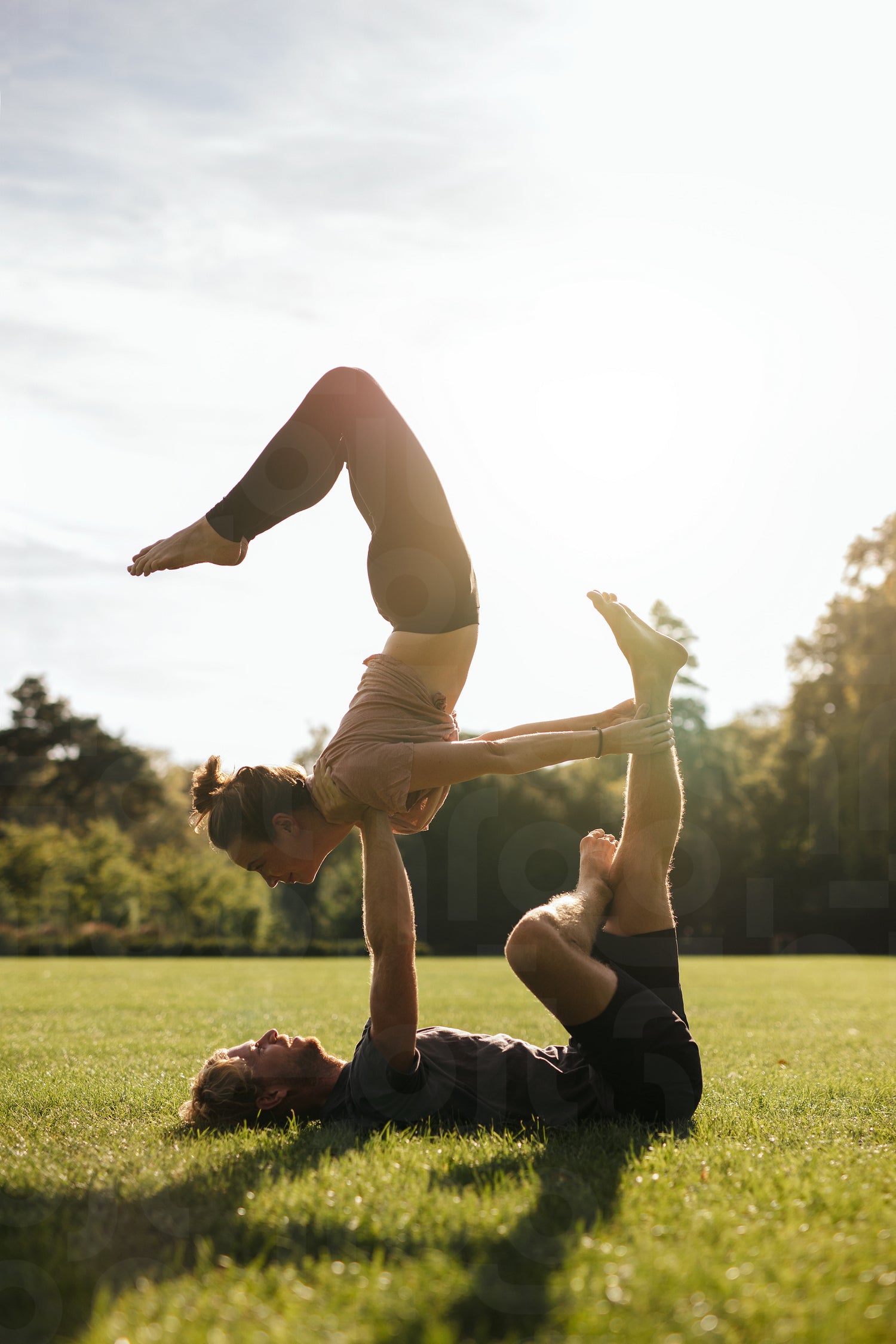 Vertical shot of healthy young couple doing acrobatic yoga on grass. Man and woman exercising in pair at the park.