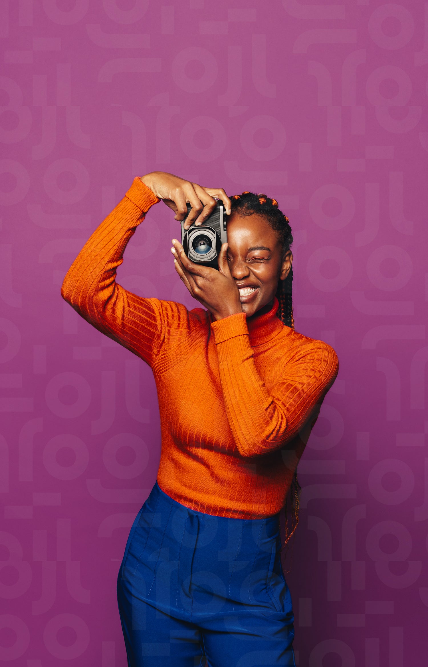 Female photographer stands with confidence and a smile, capturing a fun moment with her digital camera. Vibrant purple background & cheerful smile. Casual style and braided hairstyle add to her relaxed lifestyle.