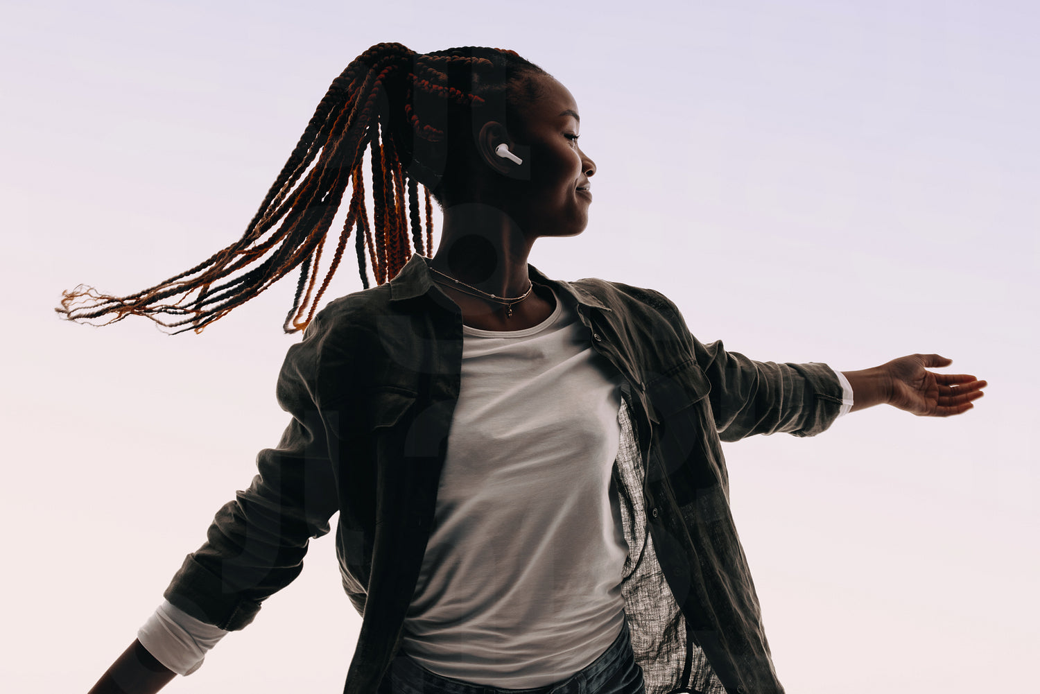 Confident African woman celebrates her vibrant lifestyle with expressive dancing in a studio. Listening wirelessly on earbuds, she embodies the fun of Gen Z, flowing to the rhythm with joy.