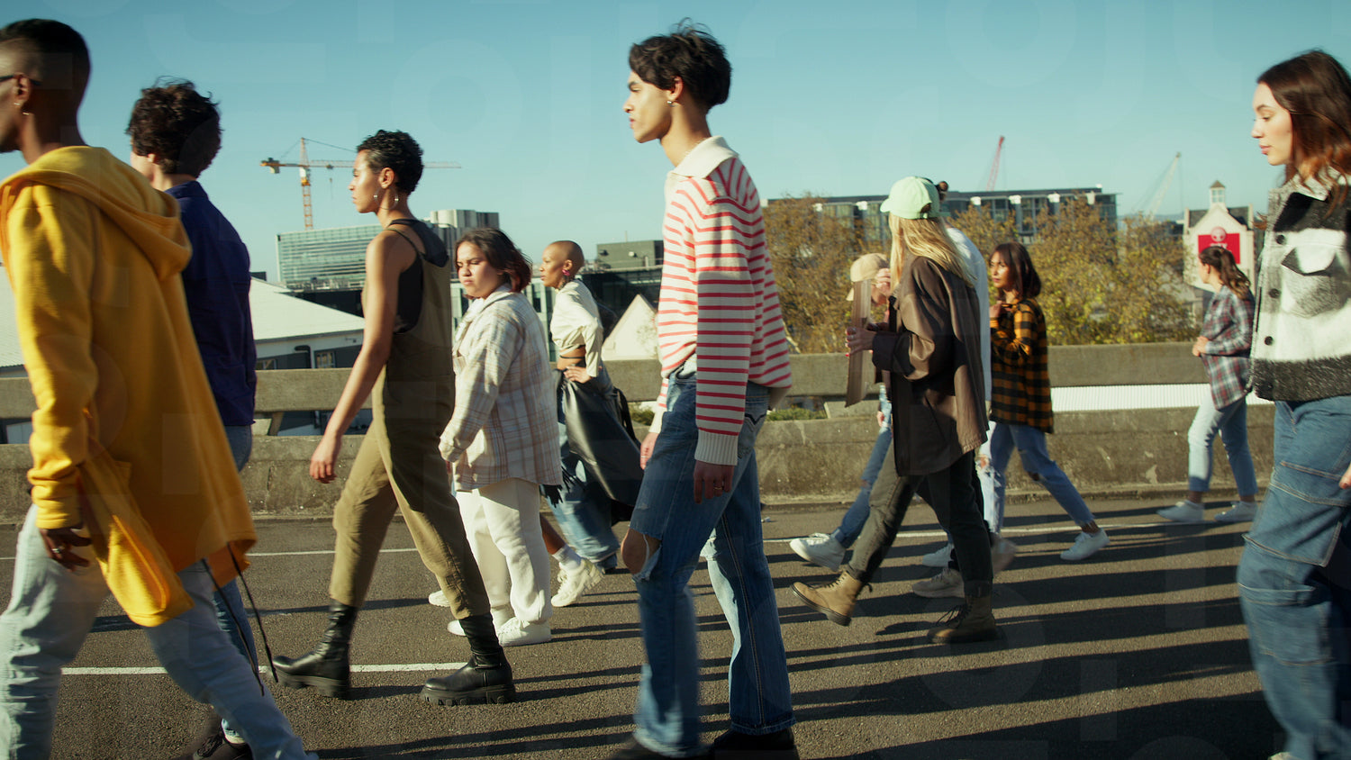 A group of people walks purposefully on a sunny urban highway. The crowd moves together, symbolizing unity, community, and forward movement in a modern city environment.