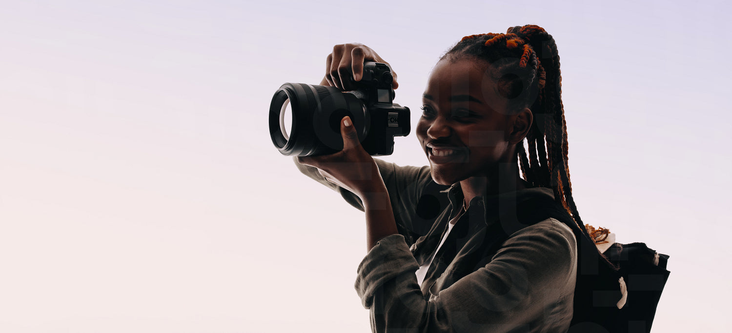 Woman with braids captures moments with her digital camera while wearing a backpack in a studio. She embodies the joy of photography, creating memories and capturing the essence of her subjects.