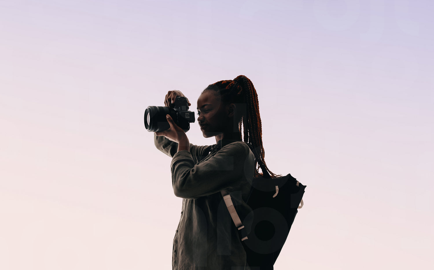 Happy young woman holding a digital camera in a studio, taking pictures with a smile. Young woman showcasing her adventurous lifestyle and photography hobby on a backpacking trip.