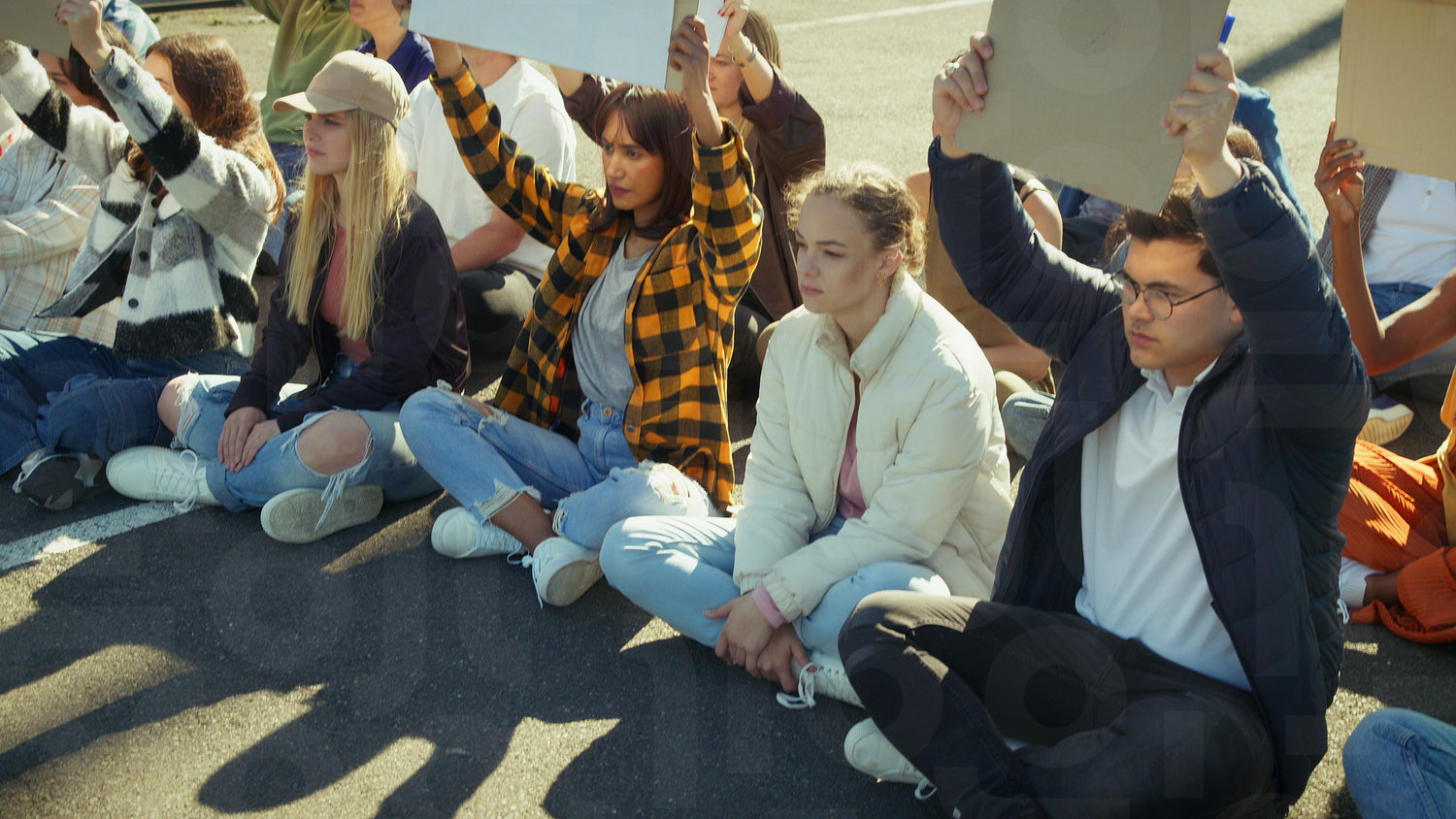 Young protestors sit on a highway road, demonstrating for their rights. Shadows of their protest signs stretch across the asphalt, depicting a powerful scene of peaceful, determined activism.