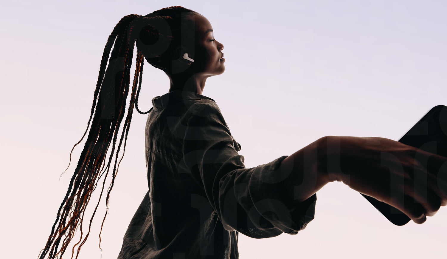 Young woman stands in a studio, holding a mobile phone with closed eyes and outstretched arms. She listens to music through wireless earphones, her expressive body language reflecting her relaxed vibe.
