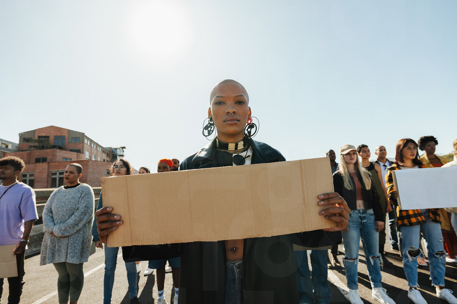 A diverse group of individuals gathering at a street protest, led by a confident young woman holding a blank cardboard sign, expressing solidarity for a meaningful cause under a clear blue sky.