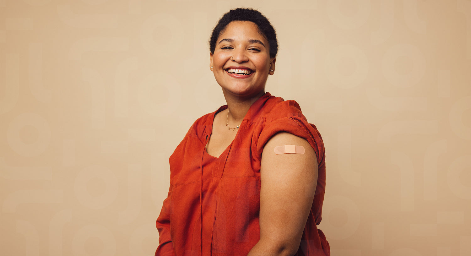 Woman looking happy after getting vaccine shot on brown background. African woman with bandage on her arm after receiving vaccination.