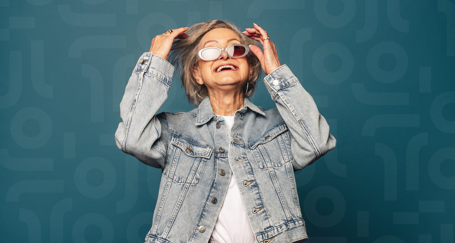 Happy senior woman wearing denim clothing and sunglasses, stands against a blue background. Her playful expression reflects her carefree and youthful spirit, capturing the essence of a fashionable mature woman.