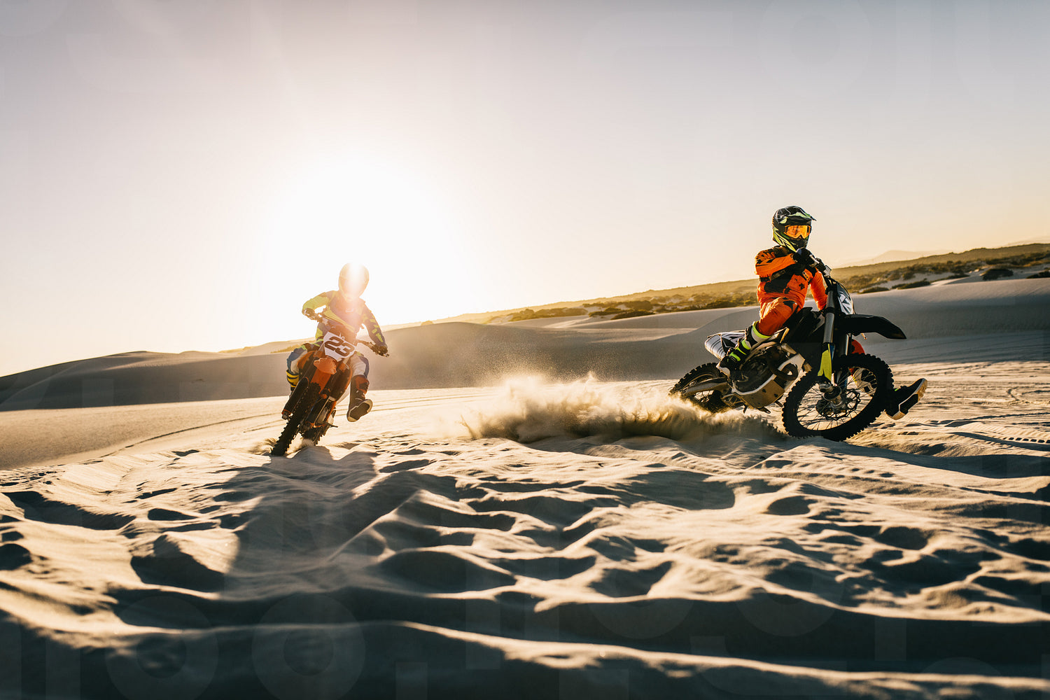 Two motocross racers racing on the off-road terrain. Dirt bikers riding motorcycles on sand dunes.