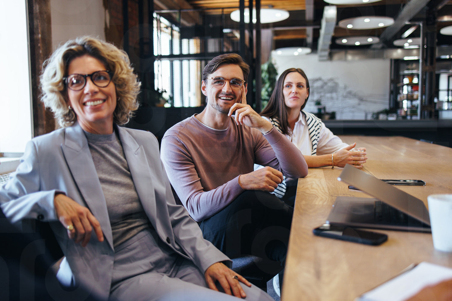 Business colleagues listening to a discussion in a meeting. Team of business people sitting together in a boardroom. Happy professionals working in a modern office.