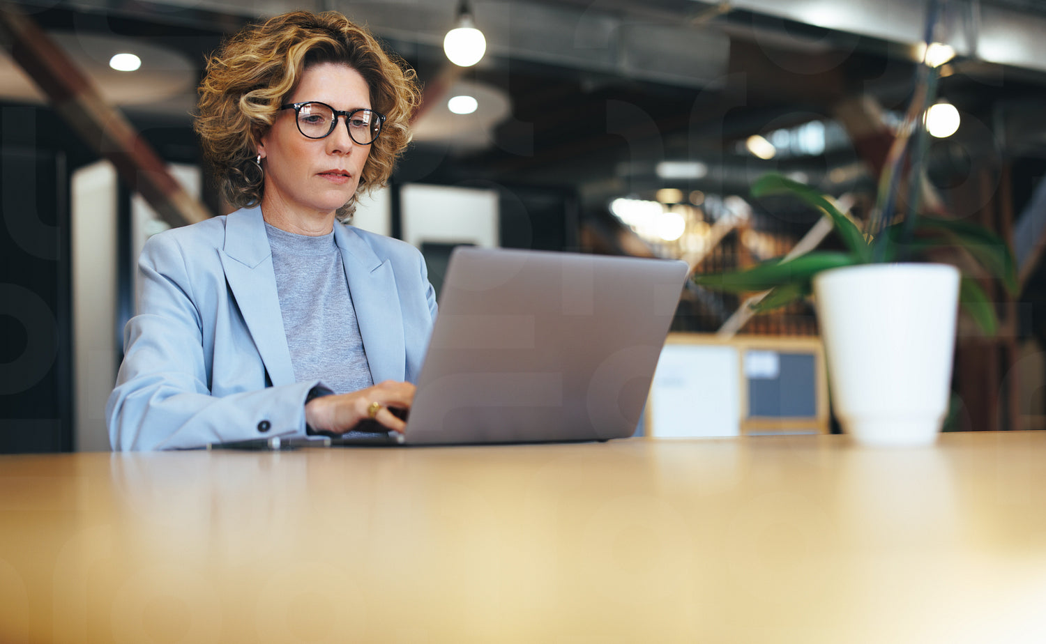 Business woman working on a laptop in a coworking office. Mature business woman working on a project online. Female professional working remotely.