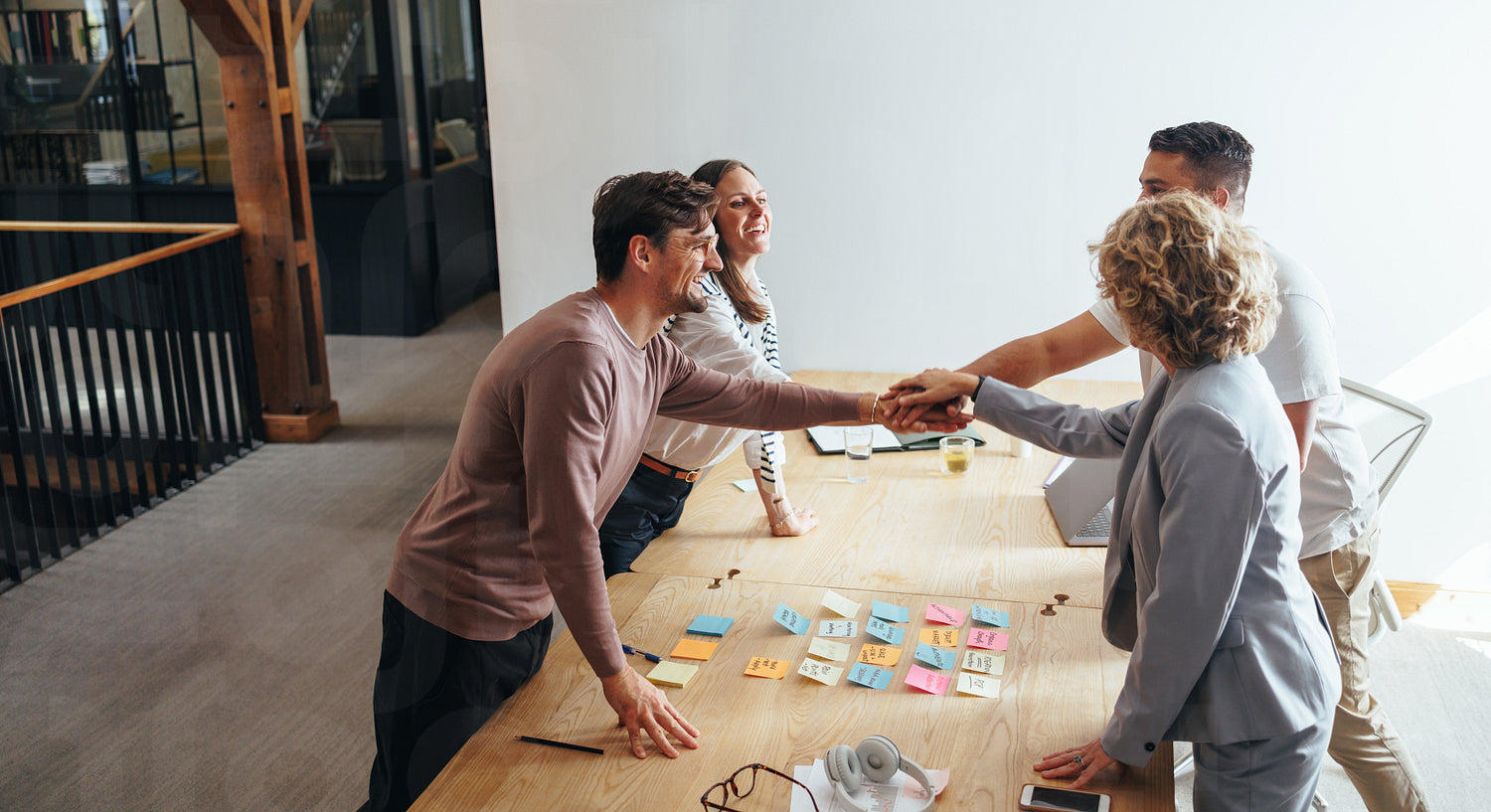 Professionals stacking hands together during a meeting in an office. Business team standing together in a boardroom