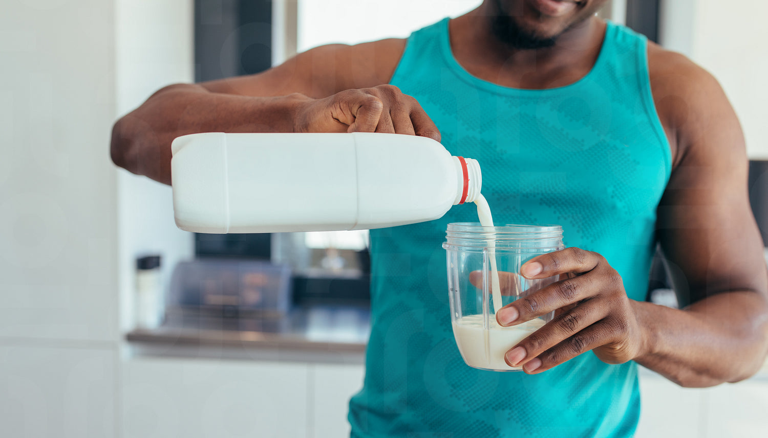 Man pouring milk in a glass after workout. Young man in kitchen preparing breakfast.